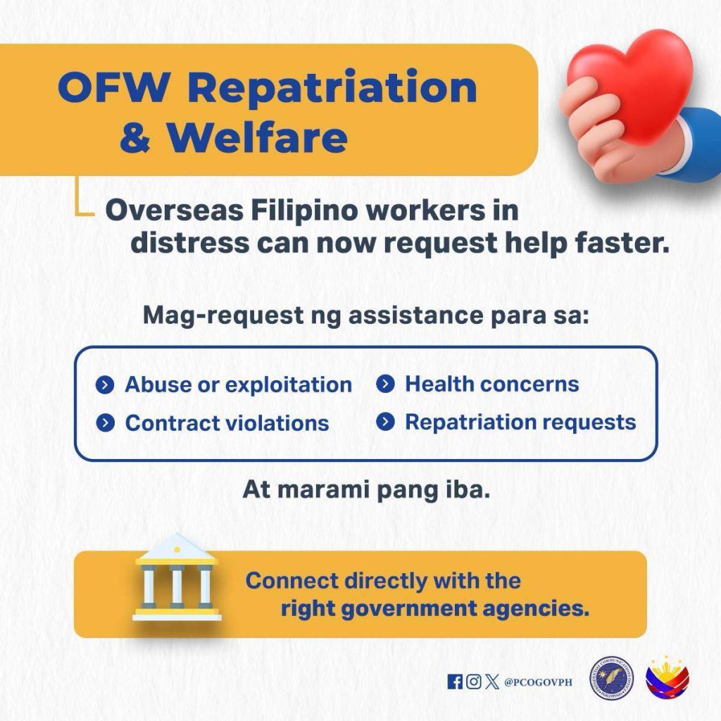 - Overseas Filipino Worker (OFW) assistance and repatriation requests
